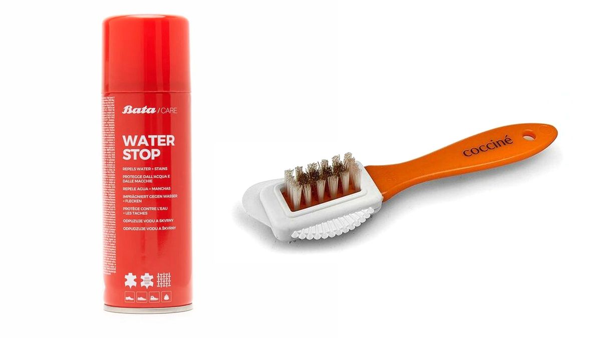 Ochranný sprej na obuv, Baťa, 139 Kč. Kartáč na semiš a nubuk, Coccine (CCC), 69 Kč