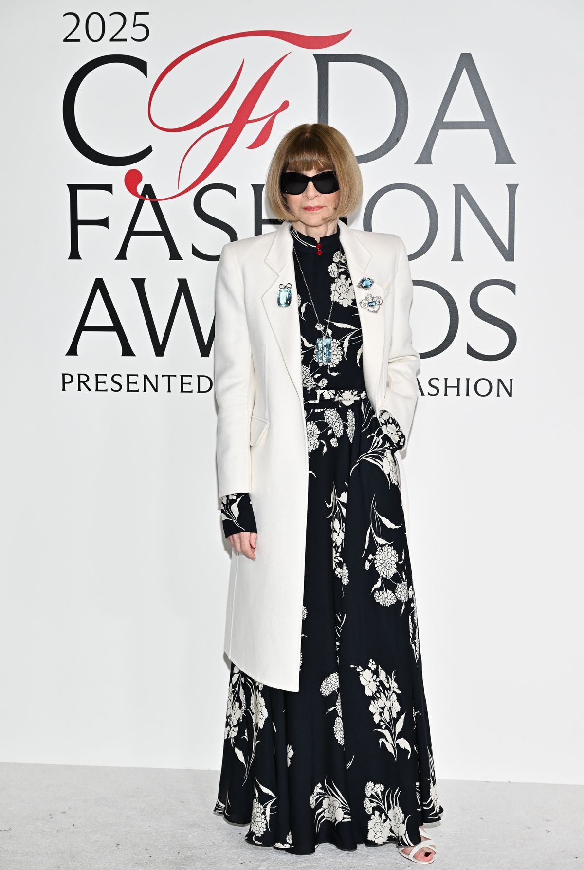Na předávání módních cen nesměla chybět šestasedmdesátiletá ikona a bývalá šéfredaktorka americké Vogue Anna Wintourová, která dorazila ve svých oblíbených květovaných černých maxi šatech a bílém kabátu zdobeném broží. Ostatně na černobílé variace vsadilo hodně přítomných celebrit.