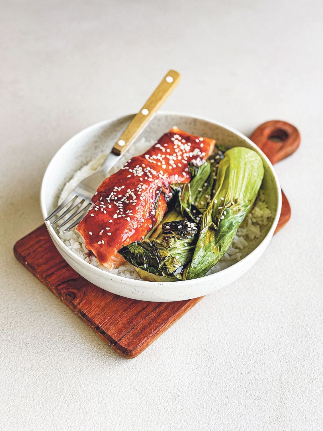 Pikantní losos s rýží a pak choi (druh čínského zelí)