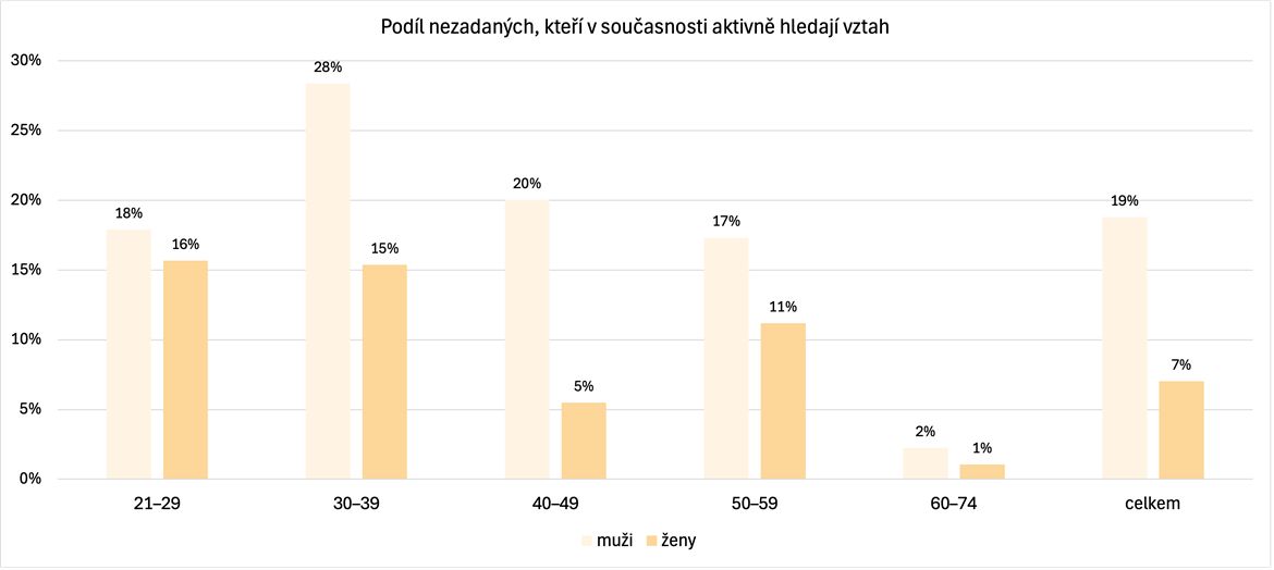 Celkově je nejvyšší podíl nezadaných v nejmladší věkové kategorii 21 až 29 let; partnera či partnerku nemá 38 procent mužů a jen čtvrtina žen. Zhruba dvě třetiny nezadaných uvádějí, že se vztahům sice nebrání, ale aktivně je nevyhledávají. Jen sedm procent mužů a na druhé straně až 18 procent žen říká, že „jsou single z přesvědčení a o žádný vztah zkrátka nestojí“.