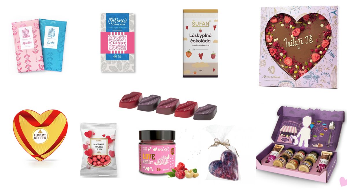 Ajala Valentýnský balíček, funkční čokolády Afrodíté & Erós, které obsahují magické bylinky, co odplaví napětí a společně zažehnou jiskru; 298 Kč; Míšina čokoláda Z lásky, 160 Kč; Šufan Láskyplná čokoláda s malinou a jahodou, 169 Kč; Steiner a Kovarik Velké srdce z mléčné čokolády s nápisem Miluji Tě, 500g, prazskacokolada.cz 648 Kč; Ferrero Rocher srdce, 189 Kč; Malinový kousek lásky, poex.cz 26 Kč; Valentýnská kolekce 5 pusinkových pralinek – 70g, mosaicpralines.cz 189 Kč; Valentýnská Mixitella od Nykki – Love Berry, mixit.cz 190 Kč; Jankovo vesmírné srdíčko s arašídovým nugátem – crunchy, cokoladovnajanek.cz 340 Kč; Big Boy Láskyplný degustační set, 599 Kč