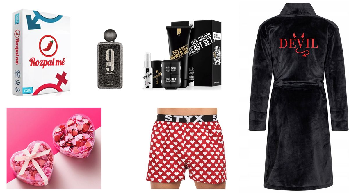 Albi Rozpal mě! – odvážná hra pro páry, 499 Kč; Vůně 9 PM Night Out, parfémový extrakt unisex, cz.afnan.com 1195 Kč; Angry Beards Dárková sada pro sportovce Jack Saloon, základní sada pro každého akčního chlapa, 799 Kč; Pánský župan ByShelly, allegro.cz 1006 Kč; Douglas Collection Seasonal Love is all around, sladké konfety do koupele ve tvaru srdce, 129 Kč; Pánské trenky Styx art sportovní guma srdíčka, trenyrkarna.cz 343 Kč;