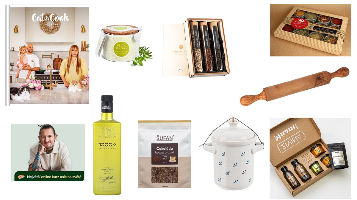 Kuchařka Cat&Cook Zbytková, 95 rychlých variabilních receptů, shop.catandcook.cz 679 Kč; Solný květ - Flor de Sal - s bylinkami v keramické dóze 100 g, naturalmallorca.cz 399 Kč; Sada velkých zkumavek se 3 druhy Kampotského pepře v dárkové krabičce (3× 70 g), pepperfield.cz 1999 Kč; Výběrová degustační sada koření Světová kuchyně, kralovstvichuti.cz 595 Kč; Váleček na těsto z olivového dřeva, olivove.cz 670 Kč; Poukaz na online kurz Asie od Přemka Forejta, kurzypremekaforejta.cz 1832 Kč; Extra panenský olivový olej Le Tre Colonne Olisir 1000+ s maximem polyfenolů, olivum.cz 1090 Kč; Šufan BIO Horká tmavá čokoláda 70% Peru, sufan.cz 579 Kč; Nakládací hrnec na zeleninu 2,8 l , Orion 699 Kč; Vánoční balíček Miluji Živinu, šest bestsellerů, zivina.cz 1099 Kč