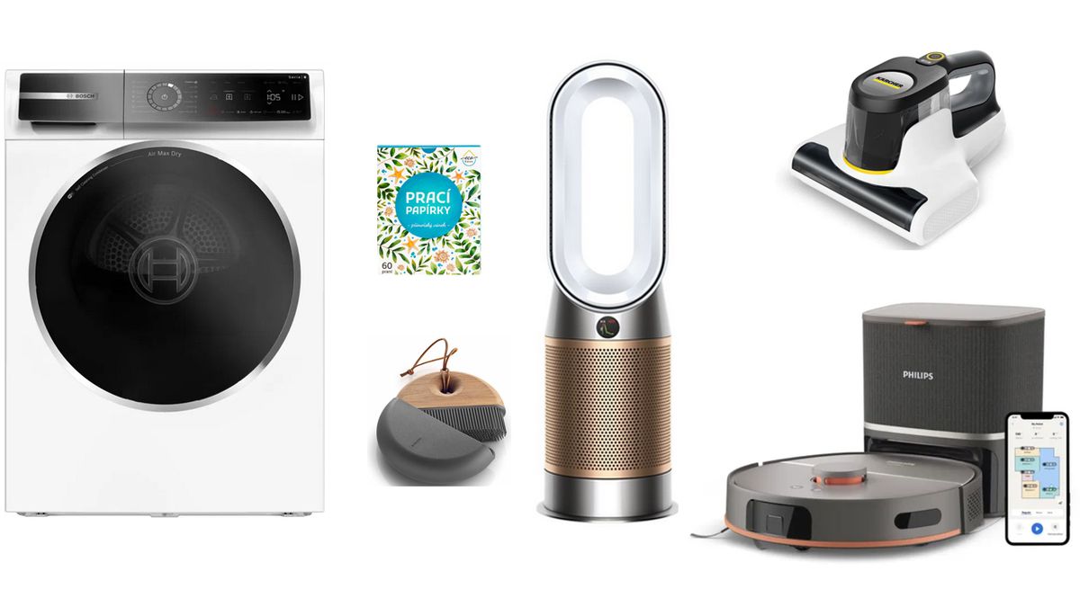 Sušička prádla Bosh WRB247CNBY Serie 8, na 9 kg prádla, energetická třída A, 32 990 Kč; Prací papírky EcoHaus 60 praní přímořský vánek, 420 Kč; Eva Solo Smetáček a lopatka, 1425 Kč; Čistička vzduchu Dyson Purifier Hot+Cool HP2 De-NOx, pokročilý systém čištění vzduchu automaticky zachytí o 50 % více NO₂, v zimě zahřeje, v létě osvěží, dyson.cz 20 590 Kč; Antibakteriální vysavač KÄRCHER VCH 4 UVClean, pro hloubkové čištění matrací, 2990 Kč; Philips Robotický vysavač a mop HomeRun 5000, výkonné sání a účinné vytírání, 12 999 Kč