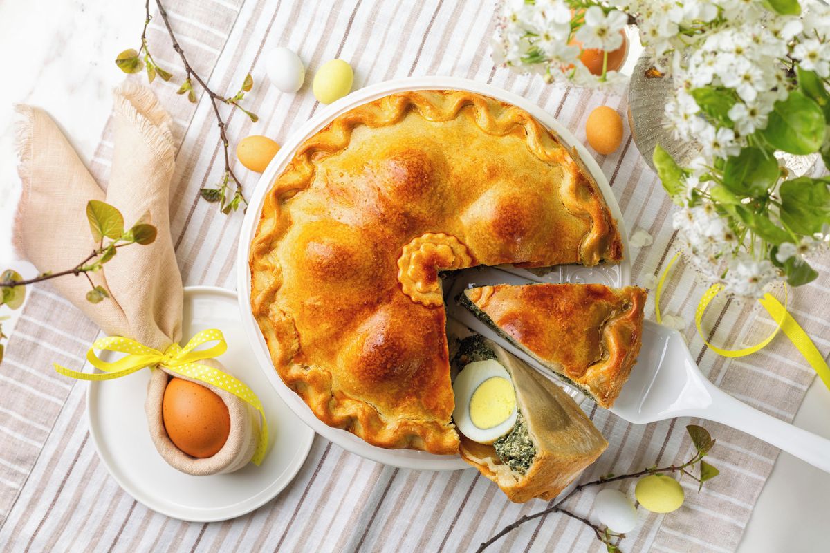 Slaná buchta torta pasqualina plněná špenátem, ricottou a vajíčky