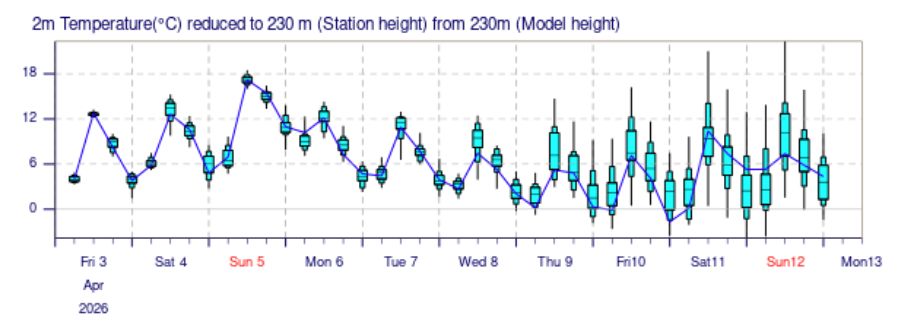 Meteogram teplot pro Ostravu - od poloviny příštího týdne je rozptyl předpovídaných teplot veliký, ale vypadá to na chladnější variantu