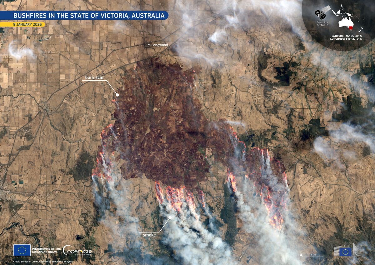 Největší požár aktuálně zuří v blízkosti města Longwood, asi 110 kilometrů severně od hlavního města státu Melbourne. Oheň tam už spálil zhruba 35 tisíc hektarů křovin a má na svědomí také jedno úmrtí. Na satelitních snímcích je patrná rozsáhlá tmavá plocha spáleného území i aktivní ohniska na jeho okrajích.