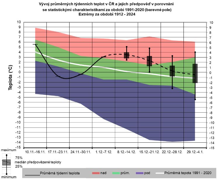 Předpovídaný vývoj teplot na území Česka od 8. prosince do 4. ledna