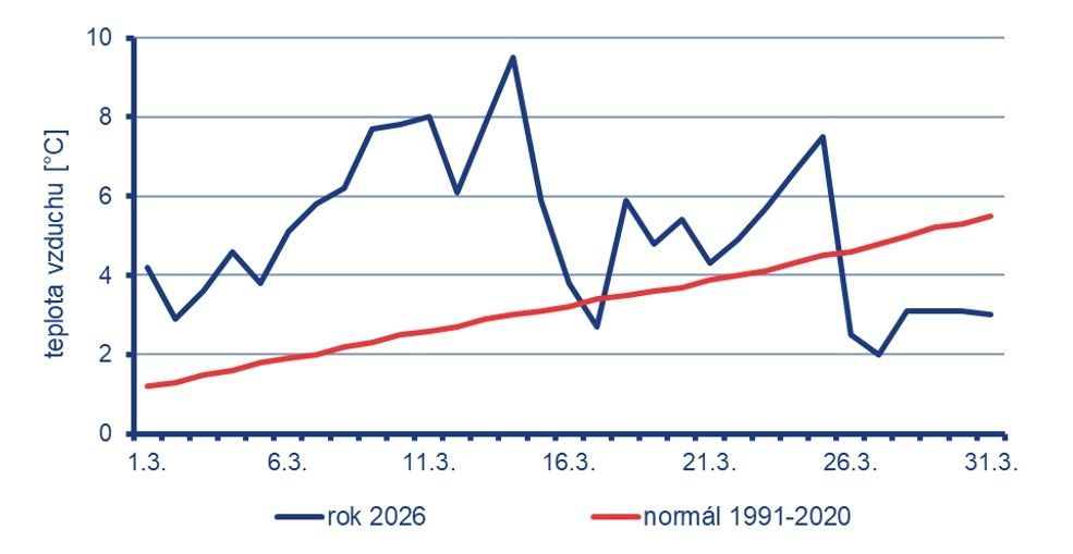 Podle předběžného hodnocení Českého hydrometeorologického ústavu (ČHMÚ) dosáhla průměrná teplota vzduchu v březnu 5,2 °C, což je o 2 °C více než dlouhodobý normál z let 1991–2020.