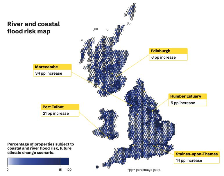 Zpráva poodhaluje, že stále více nemovitostí bude vystaveno většímu riziku. Například v Anglii by se podle analýzy měl do poloviny 21. století počet nemovitostí ohrožených záplavami zvýšit z 6,3 na osm milionů. Ve vysoce rizikových oblastech může jít dokonce o nárůst až o 66 procent.