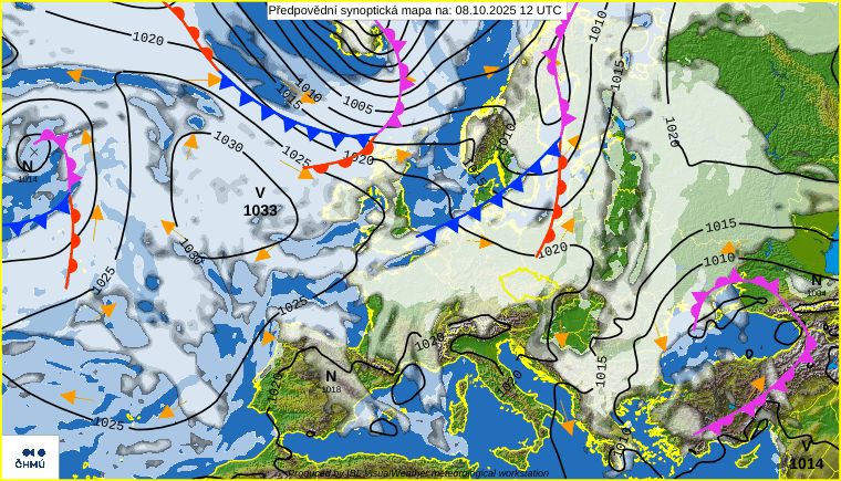 O víkendu se pak naše území ocitne mezi dvěma výraznými tlakovými útvary. V prostoru mezi stabilní výší nad Britskými ostrovy a hlubokou tlakovou níží nad severovýchodní Evropou zesílí příliv studeného oceánského vzduchu od severozápadu.