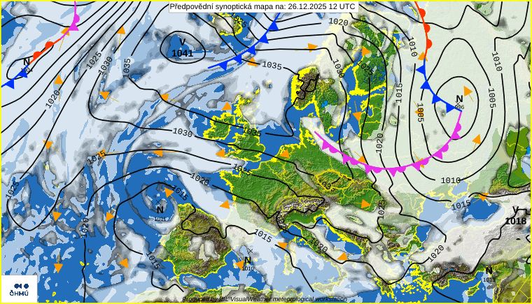 Po přední straně mohutné tlakové výše se středem nad severozápadní Evropou k nám bude během vánočních svátků pronikat chladný a suchý vzduch od severu. Mlhy a nízká oblačnost se budou vytvářet jen výjimečně a na většině území se ukáže slunce. Vzhledem k jasné obloze, suchému vzduchu a slabému větru teploty po ránu klesnou až k -10 °C a zejména na první svátek vánoční se očekává i tzv. ledový den, kdy teplota nepřekročí nulu.