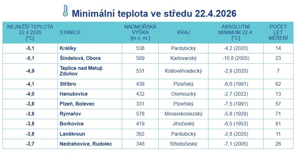 Během noci na středu se na většině území postupně vyjasnilo, což podpořilo ochlazování. Nejnižší ranní teploty tak často klesaly k bodu mrazu nebo pod něj.