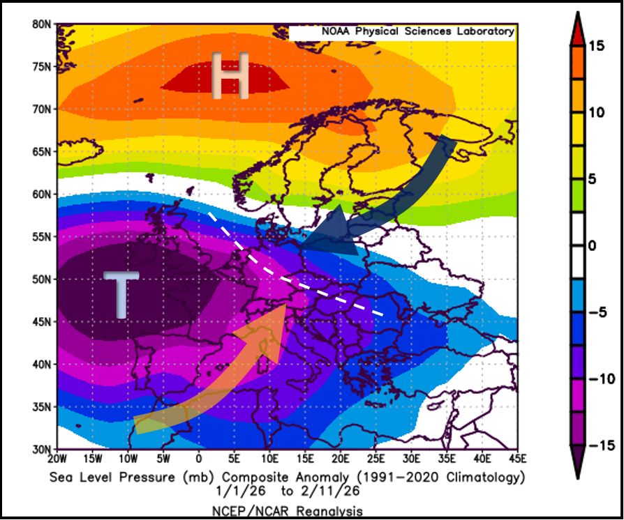 Od začátku roku převládají výrazné tlakové výše nad severní Evropou a tlakové níže nad západní Evropou.