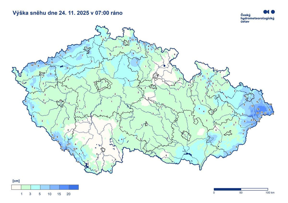„Nejvyšší sněhovou pokrývku zaznamenala stanice Velká Čantoryje na krajním východě a to 30 cm, 24 cm je na Lysé hoře v Beskydech. Dále pak například 16 cm měří Blatný vrch na Šumavě a 14 cm Klínovec v Krušných horách,“ informuje ČHMÚ.