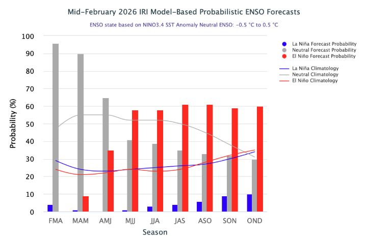 Podle předpovědi WMO by se současná chladná fáze La Niña měla během jara změnit na neutrální fázi, při níž jsou teploty mořské hladiny v oblasti ENSO v normálu. La Niña trvala od října 2025 a výrazně ovlivnila například chování polárního víru během letošní zimy.