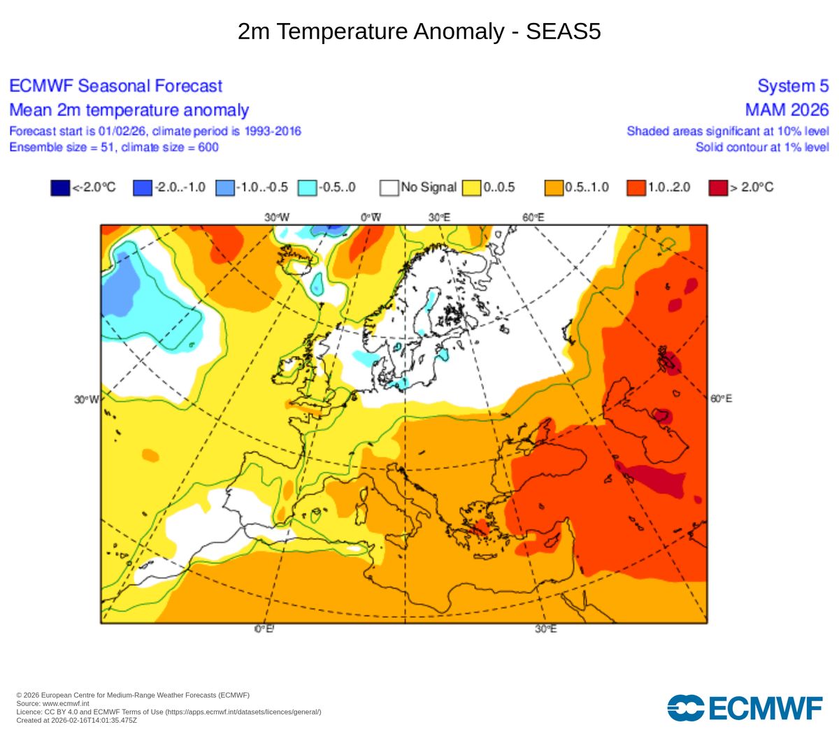 I když start jara lze čekat spíš chladný, jako celek by toto období podle modelových odhadů mělo být teplotně kolem normálu, nebo spíše lehce nad normálem. To zejména v jižních částech Evropy.