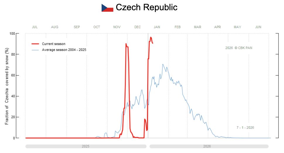 Největší sněhové plochy se vyskytují v severní, střední a východní Evropě, kde má řada zemí téměř plné pokrytí. Také v Česku máme nadprůměrný rozsah sněhové pokrývky. Zde se ale jedná o jev, který není až tak neobvyklý.