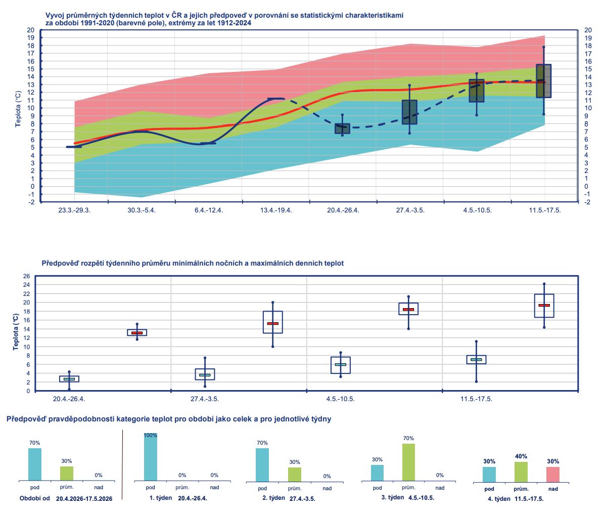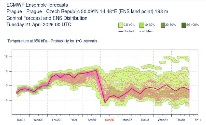Podle modelů může být příliv chladu ještě výraznější než na začátku tohoto týdne. Teploty ve výšce kolem 1500 metrů nad mořem (hladina 850 hPa) tehdy dosahovaly zhruba -3 °C, po dalším přechodu studené fronty však mohou klesnout až pod -5 °C. Běžná hodnota pro konec dubna je přitom kolem 5 °C.