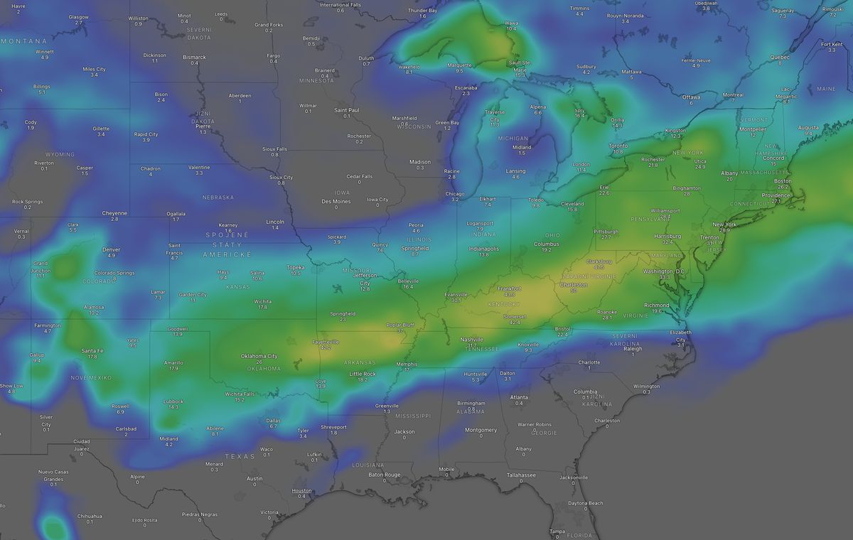 Zimní bouře by měla začít v pátek v oblasti pod Skalnatými horami a během víkendu se bude postupně šířit směrem k východnímu pobřeží, kde bude řádit až do pondělí. Typ srážek bude záviset na poloze kontaktu studeného a teplého vzduchu, zjednodušeně však bude od severu k jihu přecházet sníh, sníh s deštěm, mrznoucí déšť a déšť.
