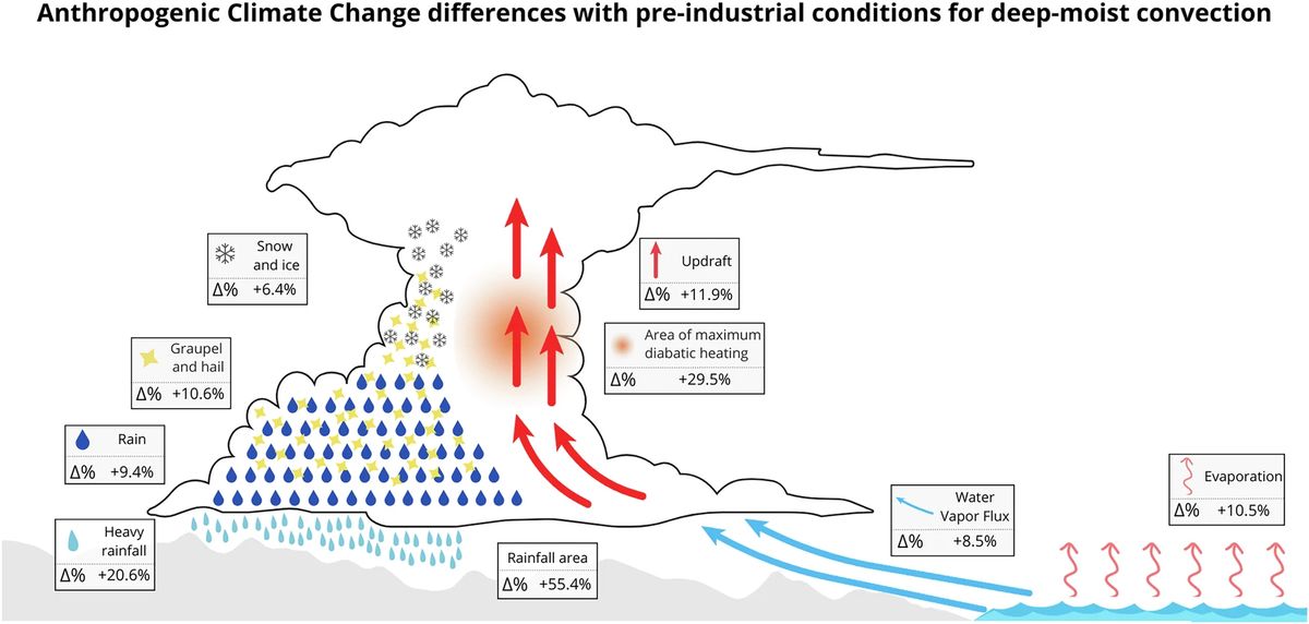 Autoři studie tento nárůst připisují zejména vyšší vlhkosti a větší nestabilitě atmosféry. Tyto změny však byly ještě výraznější, než by odpovídalo Clausius-Clapeyronově teorii, podle níž je atmosféra schopna s každým stupněm oteplení pojmout přibližně o 7 procent více vodní páry.