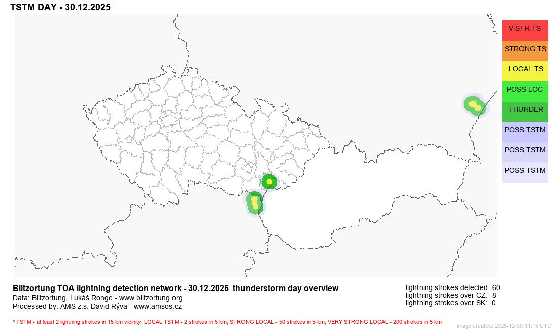 Detektory blesků na jižní Moravě zaznamenaly několik výbojů.