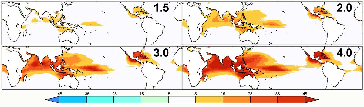 Změna pravděpodobnosti dosažení navrhované šesté kategorie při globálním oteplení o 1.5 °C, 2 °C, 3 °C a 4 °C. Čím teplejší barva, tím vyšší pravděpodobnost.