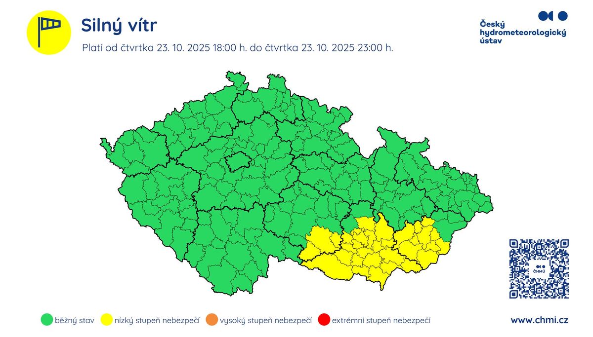 Ten zesílí během čtvrtečního večera zejména na jihovýchodě našeho území. ČHMÚ vydalo výstrahu 1. stupně, která bude platit od 18:00 do 23:00 pro jižní Moravu a jih Českomoravské vrchoviny a Zlínského kraje. Nárazy větru mohou být i kolem 70 km/h.