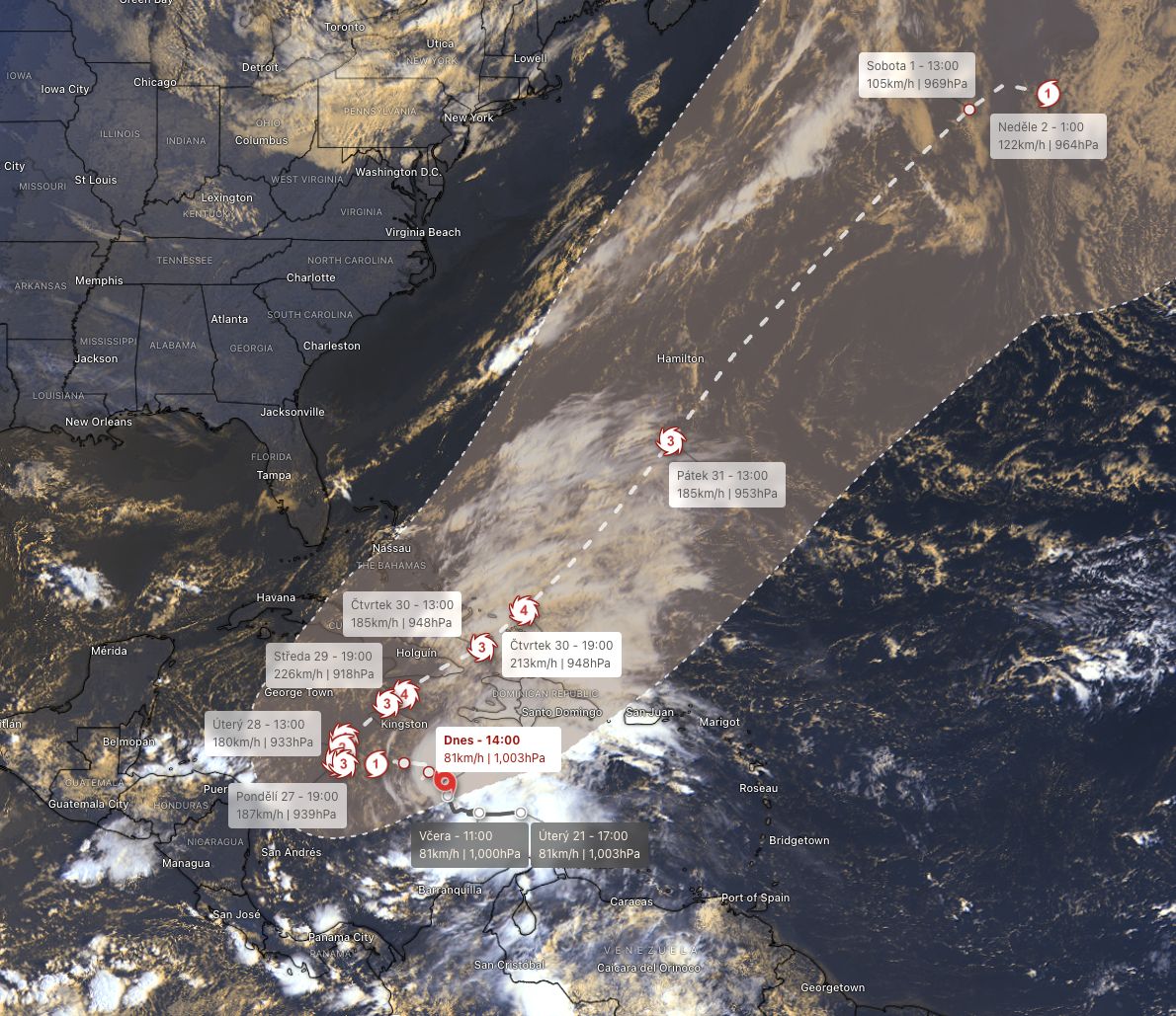 V ohrožení jsou však i další ostrovy. Současná předpokládaná trajektorie posílá příští týden v tu dobu už potenciálně velmi silný hurikán přes Jamajku a východ Kuby. Další dny napoví, jak reálný tento scénář je.