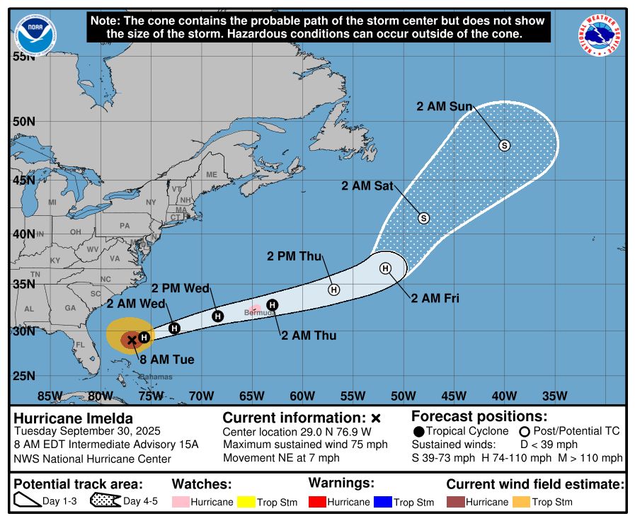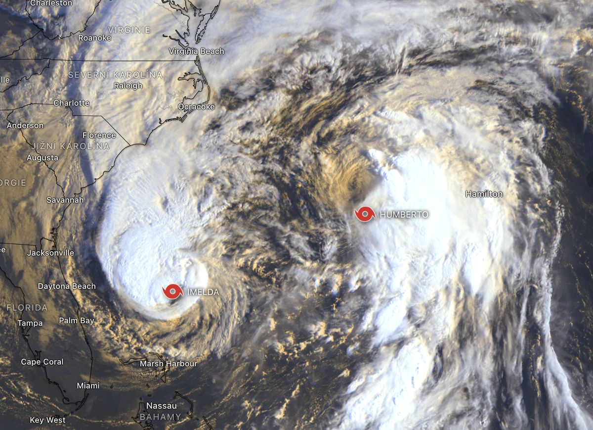 Tropická bouře Imelda přešla Bahamy a východně od Floridy zesílila na hurikán první kategorie. Hurikán Humberto má sílu kategorie 2 a nachází se západně od Bermud.