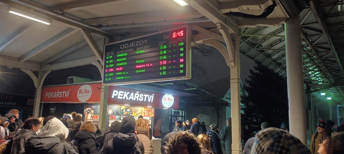 Nádraží v Lysé nad Labem v úterý ráno, vlaky měly desítky minut zpoždění