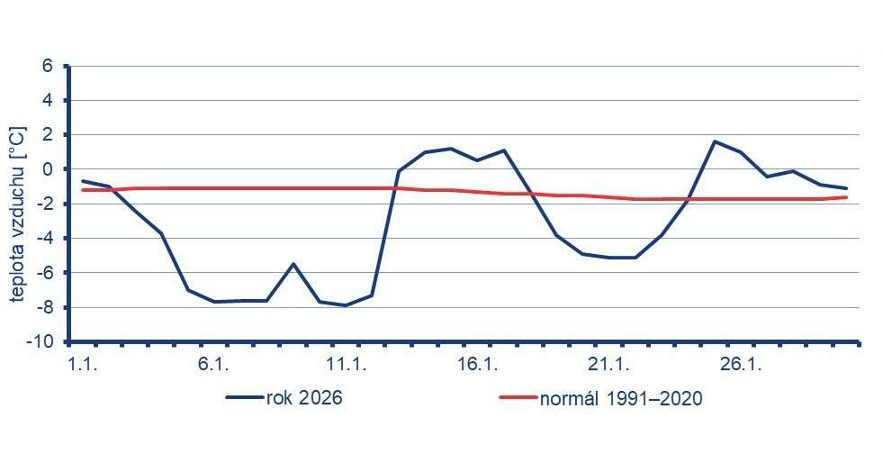 Teplota vzduchu v lednu 2026 v porovnání s klimatologickým normálem