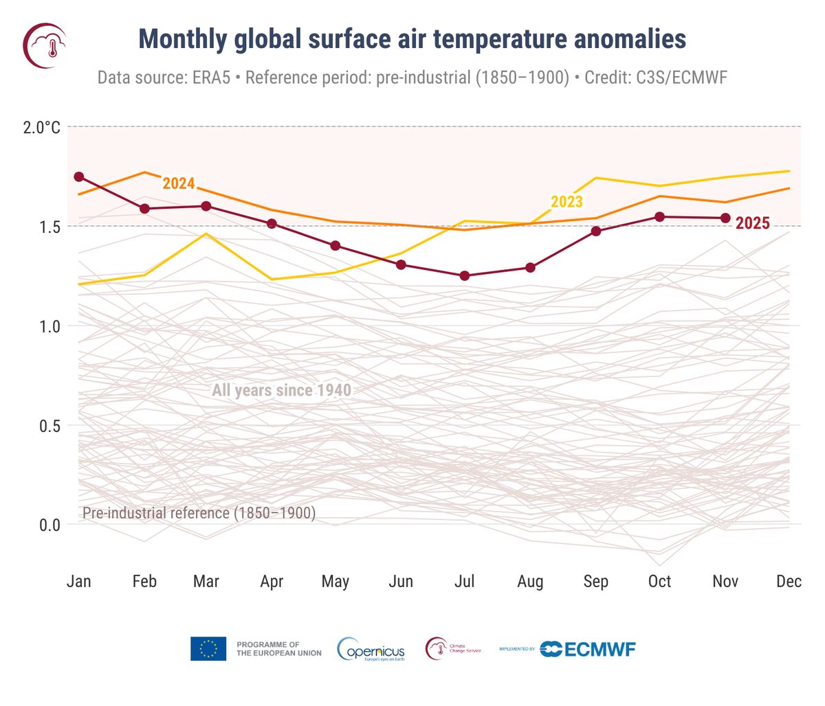 Podle zprávy programu Copernicus je již prakticky jisté, že rok 2025 skončí jako druhý nebo třetí nejteplejší rok v historii. Aktuálně se letošní rok po listopadu dělí o druhé místo s rokem 2023. Historicky nejteplejší byl loňský rok.