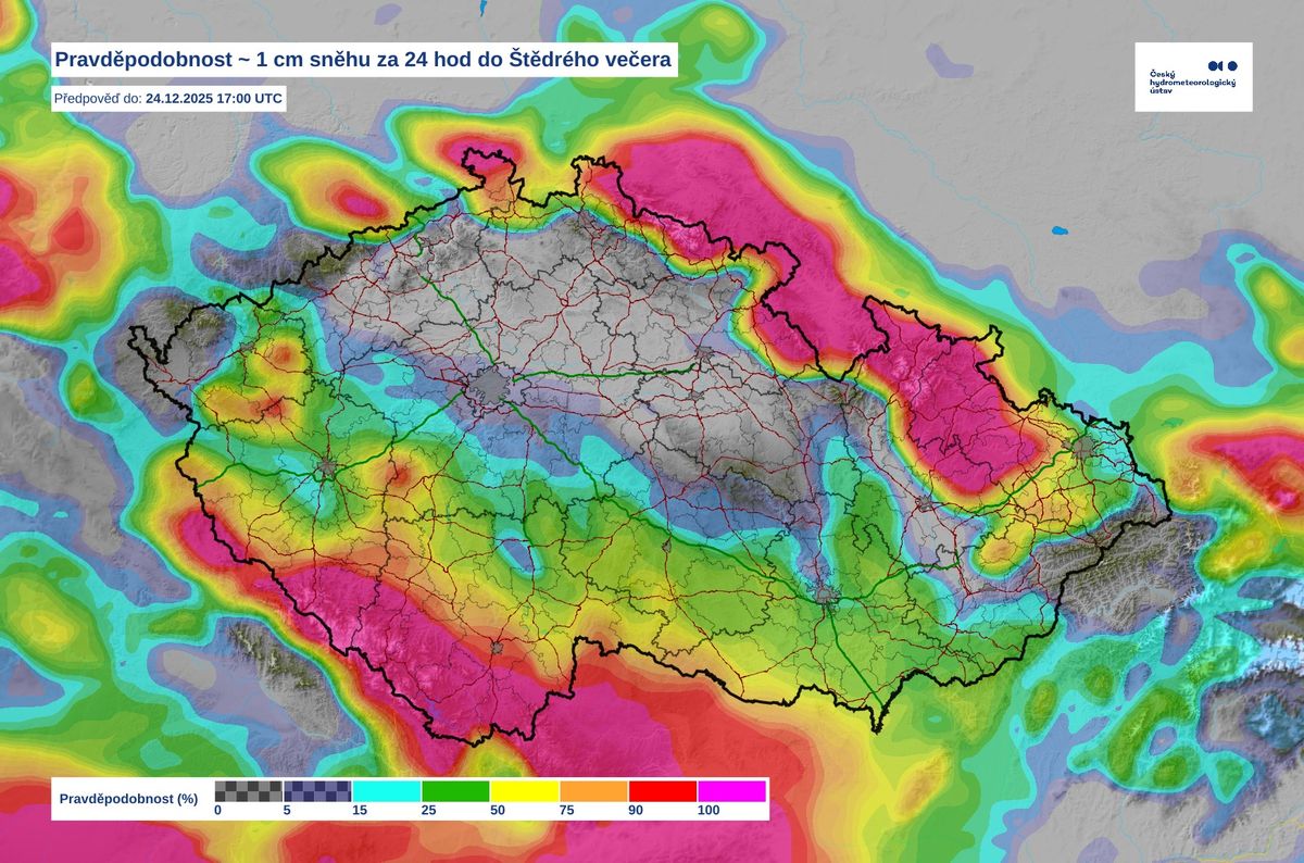 Sněžit by mělo začít během noci na Štědrý den. Týkat se to bude hlavně okrajových oblastí republiky, ale tu a tam se bílý poprašek objeví i dále od hranic, uvádí Český hydrometeorologický ústav (ČHMÚ).