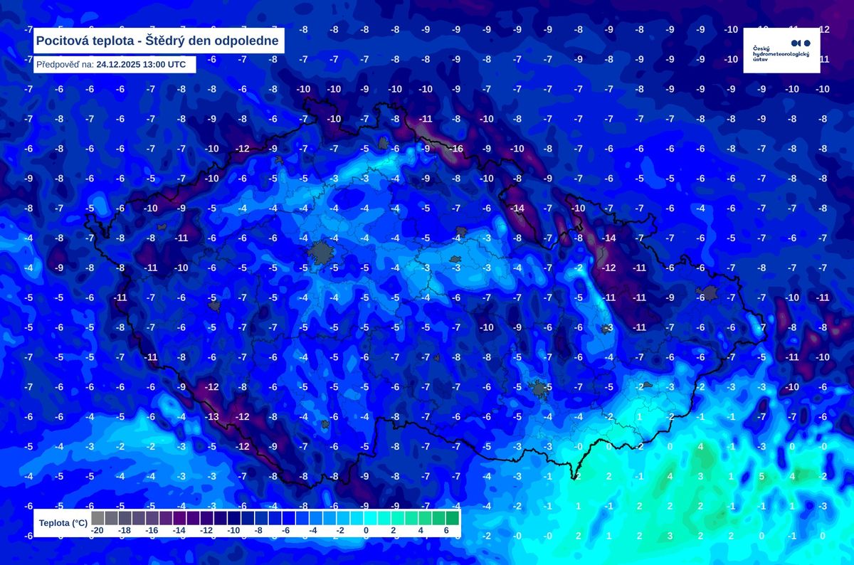 Přes den se bude dál ochlazovat a v noci na Boží hod už bude velmi chladno. Na Štědrý den navíc zesílí vítr od severovýchodu, který pocitovou teplotu ještě výrazně sníží. Někde bude klesat i přes den pod -10 °C.