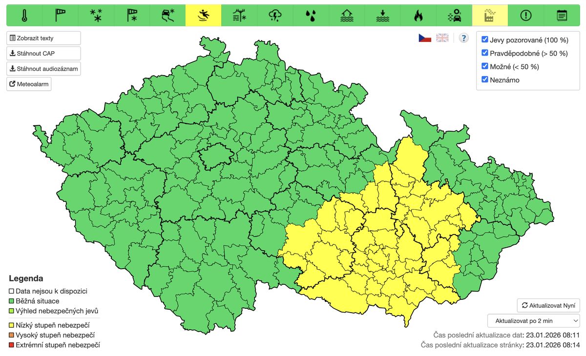 Výstraha s nejnižším stupněm nebezpečí (žlutá) platí pro celý Jihomoravský kraj, většinu Olomouckého kraje a části Zlínského, Pardubického kraje a Kraje Vysočina.