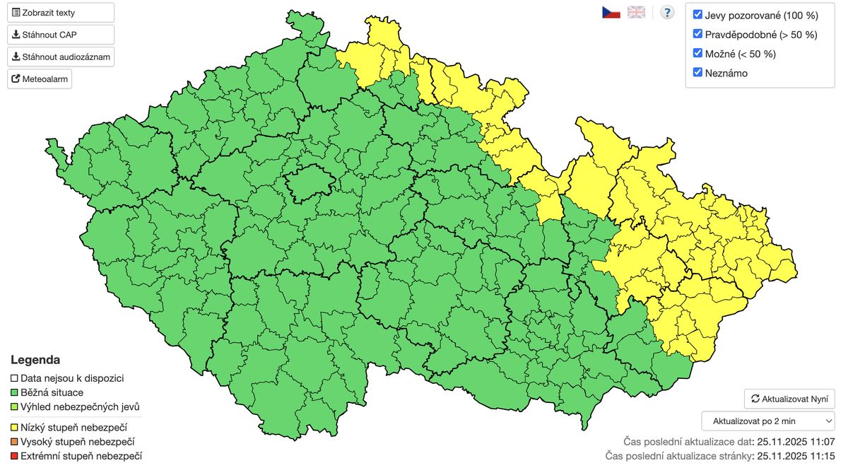„V noci na středu (26. listopadu) a během středečního dne očekáváme občasné sněžení, které bude zejména na východě a severovýchodě trvalejší a vydatnější,“ popisují situaci meteorologové ČHMÚ.