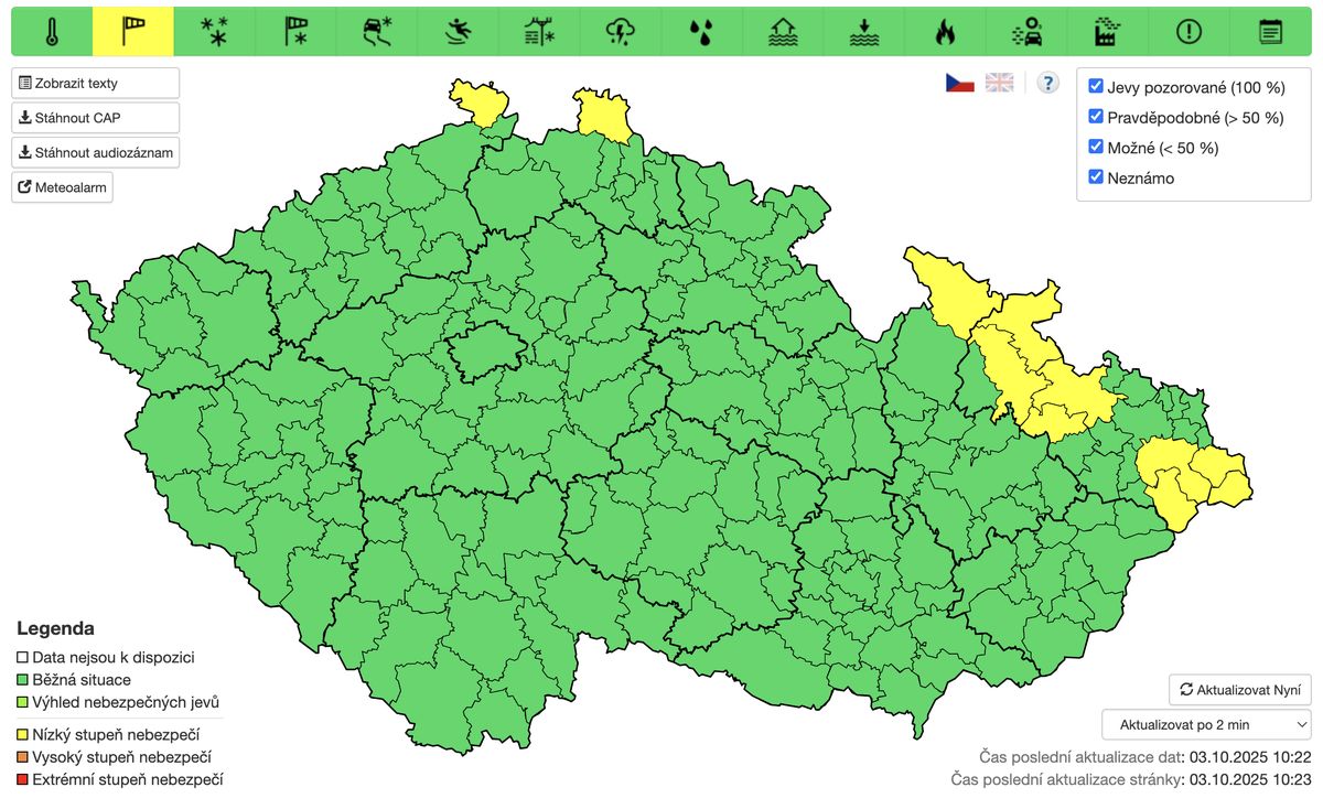 Foukat bude ale v celém Česku, jen se nepředpokládají rychlosti větru, které by odpovídaly výstraze. Podle aktuálních dat se může výstraha ještě upravovat.