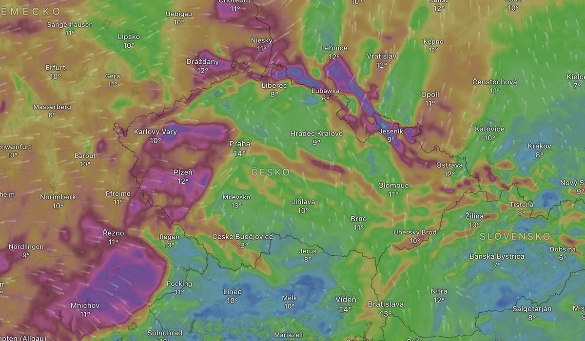 V sobotu odpoledne a večer bude vítr zesilovat a v nárazech bude mít na severu a severovýchodě Česka rychlost 15 až 20 m/s (55 až 70 km/h). Ve vrcholových partiích hor budou nárazy větru ještě silnější.