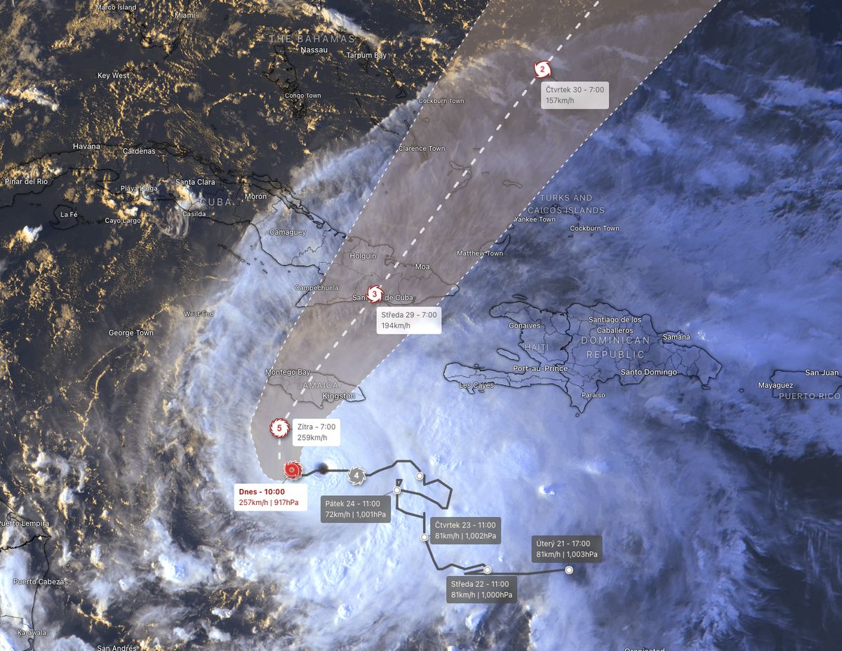 Hurikán Melissa o víkendu rychle zesílil nad velmi teplými vodami Karibského moře. V noci na pondělí nabíral stále na síle a prozatím dosáhl čtvrté kategorie, s centrálním tlakem 962 hPa a maximální rychlostí větru až 242 km/h.