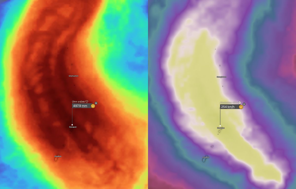 Úhrn srážek a maximální nárazy větru na Severních Marianách od pondělí do čtvrtka podle modelu ECMWF