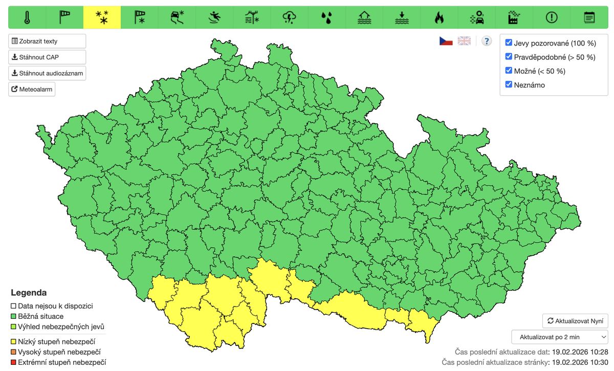 Nízký stupeň nebezpečí (žlutá výstraha) platí na jihu Jihočeského a Jihomoravského kraje. Podle meteorologů zde může místy napadnout sedm až dvanáct centimetrů sněhu během dvanácti hodin. Výstraha začne platit ve čtvrtek v 18 hodin a potrvá do pátečních šesti hodin ráno.