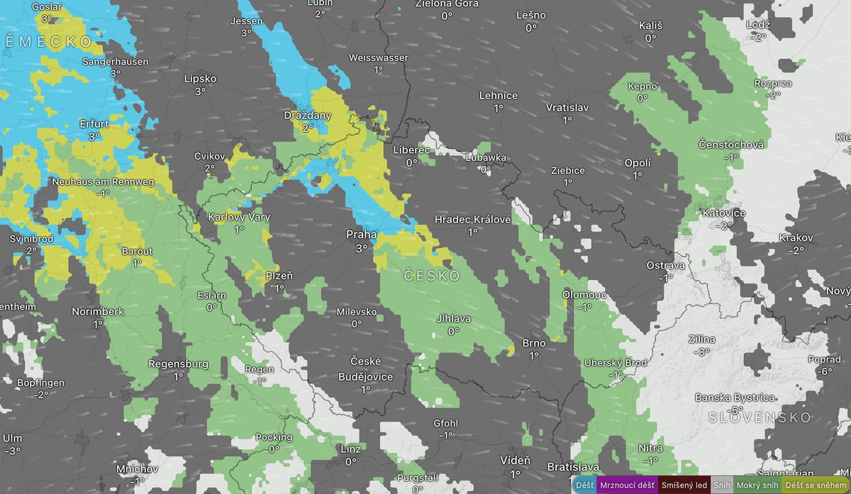 V nižších polohách by měl hlavně k večeru, kdy budou teploty stoupat nad nulu, padat mokrý sníh, v nižších polohách v Čechách a také na jihu Moravy i déšť nebo smíšené srážky.