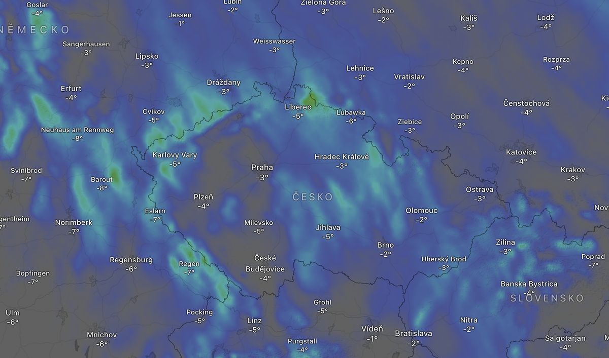 O půlnoci bude také pěkně větrno, zejména v jihozápadní polovině Česka, a také na horách. Teploty budou na většině území Čech a také na jižní Moravě už lehce nad nulou. Jinde ještě lehce pod nulou.