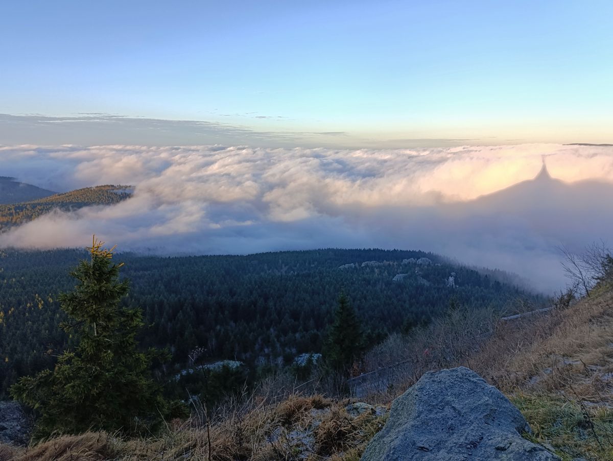 KRÁTCE: Současná jednotvárná šeď ve městech nebere konce a jedinou šanci na spatření modré oblohy stále nabízí jen hory. Odpolední slunce v těchto dnech promítá siluetu Ještědského hřbetu s dominantním vysílačem na hladinu mohutné inverzní poklice, která již téměř dva týdny zakrývá nejen Liberecko, ale prakticky celou českou kotlinu. Horní hranice nízké oblačnosti během pátku kolísala mezi 900 až 1000 metry nad mořem a čerstvý jihovýchodní vítr chvílemi vyfoukával chuchvalce mlhy po návětrné části svahu i přes samotný vrchol Ještědu. O Vánocích do Česka od severovýchodu začne proudit suchý mrazivý vzduch, což povede k ukončení inverzního charakteru počasí a rozpuštění mlh. Od čtvrtka se po delší době dočkáme slunečního svitu i v nížinách.