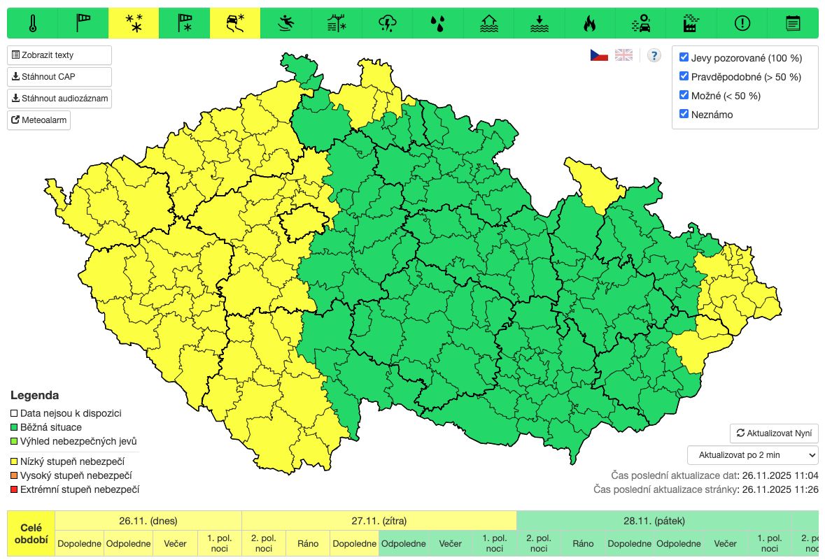 Ti zároveň upravili územní i časovou platnost předchozí výstrahy před novou sněhovou pokrývkou. Aktualizovaná výstraha platí pouze pro některé oblasti Jizerských hor, Jeseníků a Beskyd, včetně města Ostravy a jeho okolí.