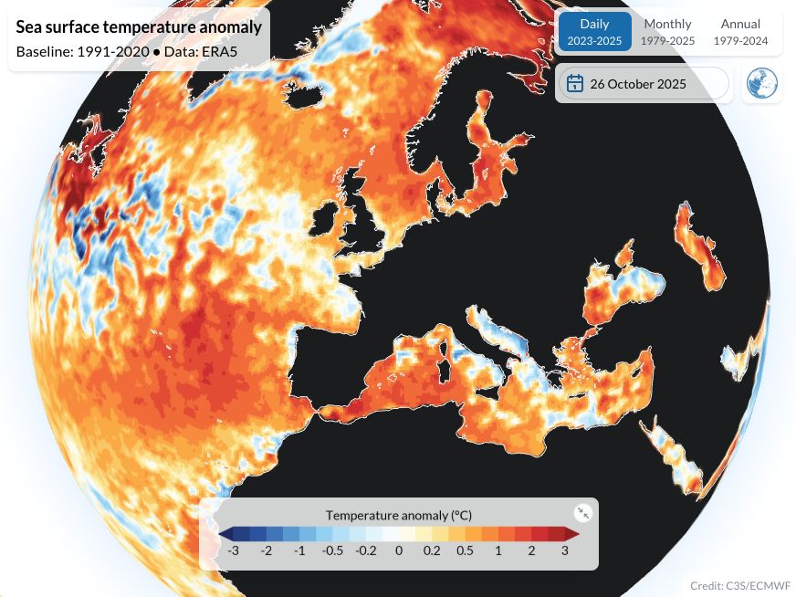 Nejvýraznější odchylky se objevují v západním Středomoří a v Atlantiku mezi Azory a Pyrenejským poloostrovem. Tam jsou teploty až o 3 °C vyšší, než je na přelomu října a listopadu obvyklé. Nadprůměrné hodnoty přetrvávají i v severním Atlantiku a v Severním a Baltském moři.