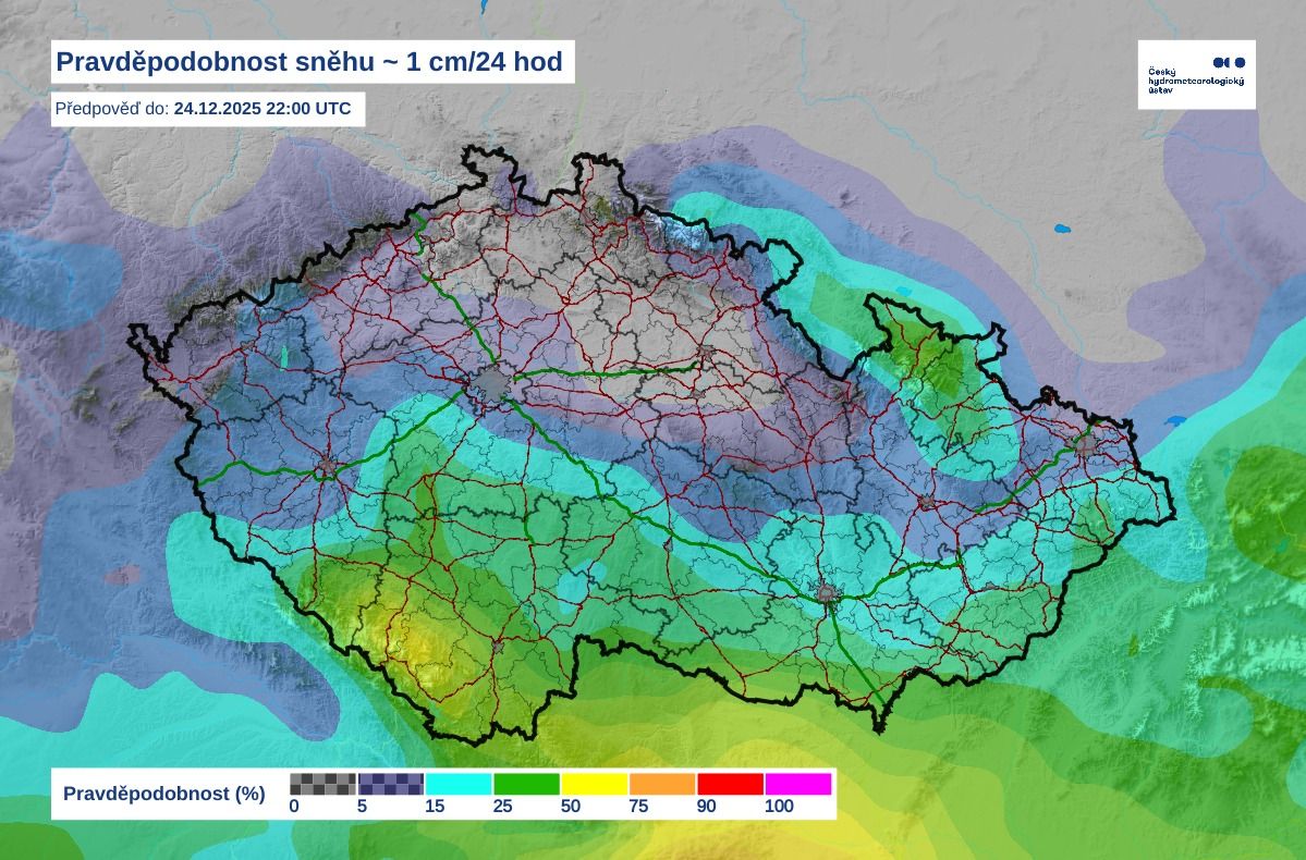 Mimo hory by mohlo lokálně spadnout na Štědrý den až 5 cm, největší pravděpodobnost je zatím v jižních částech Česka. Na většině území nejspíše sníh ležet nebude, ale podle některých modelů stále existuje pravděpodobnost, že by mohlo být sněžení plošnější.