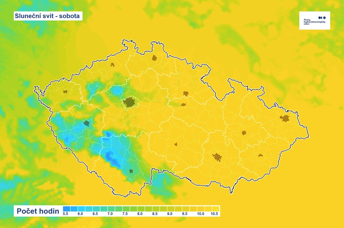 Mapa slunečního svitu na sobotu odhaluje, že by zejména v jihozápadních a středních Čechách mohly být ráno mlhy