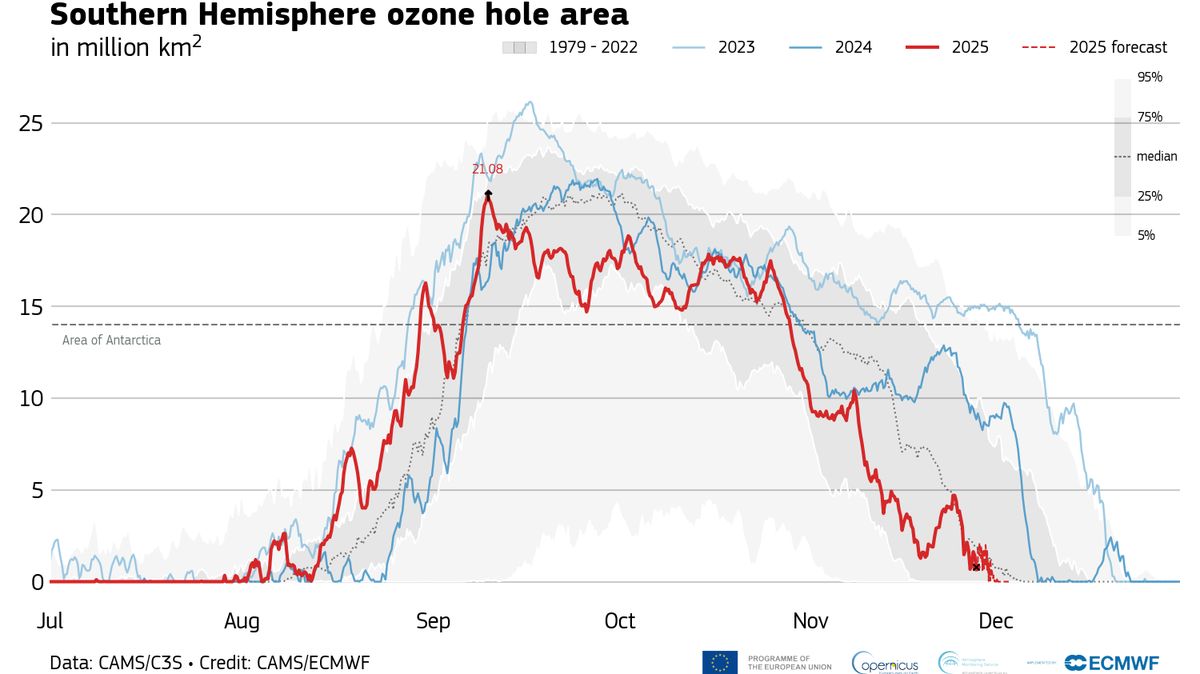 V roce 2025 se ozonová díra vytvořila relativně brzy a na začátku září dosáhla své maximální rozlohy pro dané období, 21,08 milionů km². To je výrazně méně než historické maximum 26,10 milionů km² zaznamenané v roce 2023.